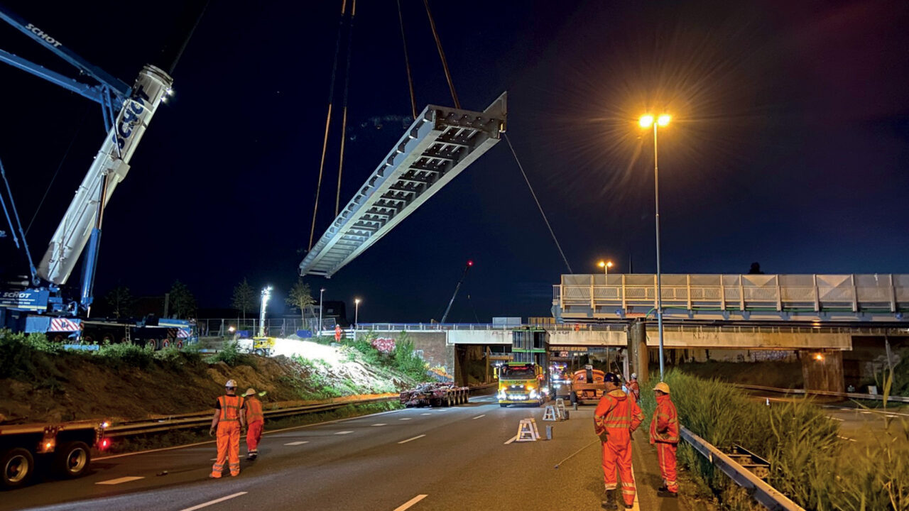 Important links in the whole “spaghetti” design of detour roads are the temporary viaducts, consisting of steel bridges made by Janson Bridging, part of the Van Schie Group. Among them are bridges with a length of around 60 meters and an average weight of 60 tons. Telescopic cranes from Van Schie Crane Rental lift them into place.