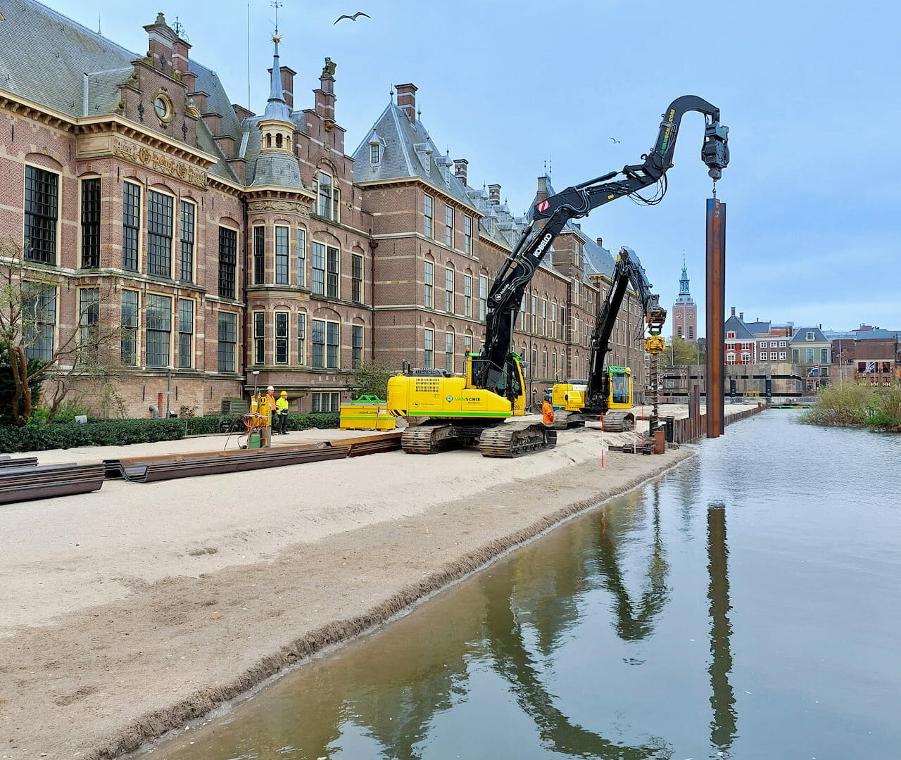 In ons eerdere Journaal hebben we uitgebreid verslag gedaan van de activiteiten van Van Schie in de Hofvijver. Zo hebben we een heuse ‘zandbank’ aangelegd langs de gevels van de Eerste Kamer en de Trêveszaal tot aan het torentje, met daaromheen een stalen damwandconstructie: 80 meter lang en 15 meter breed.