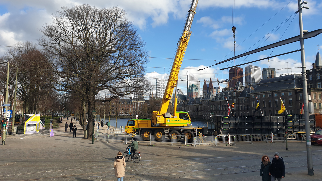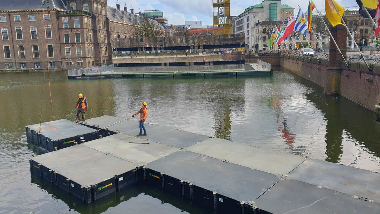 Om de bouwplaats te kunnen inrichten heeft Van Schie heeft een rijbaan op het water aangelegd, bestaande uit 160 koppelbare pontons. Die zijn in de hoek van Het Buitenhof en de Lange Vijverberg te water gelaten en in secties naar de andere kant van de Hofvijver gevaren. Om te zorgen dat de zware vrachtwagens veilig de lager gelegen pontonbaan op en af kunnen rijden, heeft het bedrijf uit Mijdrecht een brugconstructie gemaakt, bestaande uit buispalen en zware stalen schotten. Die ligt in de hoek waar de vijver het minst diep is. Eeuwengeleden, toen hier nog geen kademuren stonden, lag op dezelfde plek zelfs een strandje. Het fungeerde destijds als drinkplaats voor de paarden van de gendarmerie en de cavalerie. Er schijnt ergens in de lege gebouwen nog een afbeelding te hangen waarop wachtende koetsen te zien zijn en paarden die staan te drinken uit de Hofvijver.