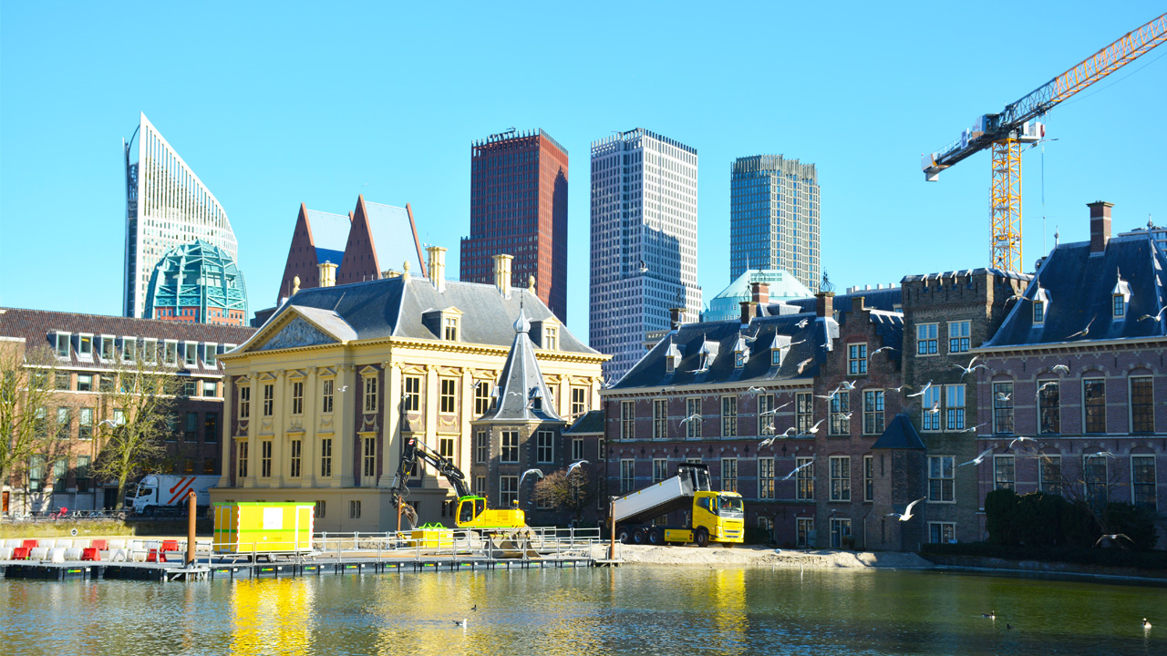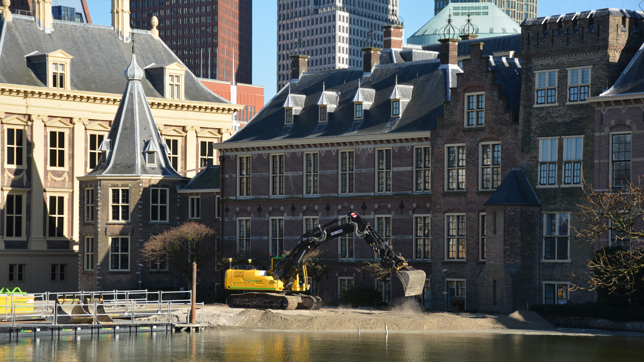 Langs de buitenkant van het gebouw wordt momenteel een 180 meter lange strook bouwterrein aangelegd, nodig om de lekkende gevels en de gebrekkige fundering te herstellen. Hiervoor wordt zand gestort en een damwand geplaatst op 15 meter vanaf het gebouw. De Hofvijver wordt gedempt met 8.400 kuub zand. Daar bovenop komen industrieplaten te liggen. Zo ontstaat een werkplatform van waaraf men de gevels grondig kan aanpakken. De funderingen worden (door het zand heen) geïnjecteerd met grout, een cementsoort die veel gebruikt wordt voor grondstabilisatie en ook grondwaterstroming kan voorkomen.