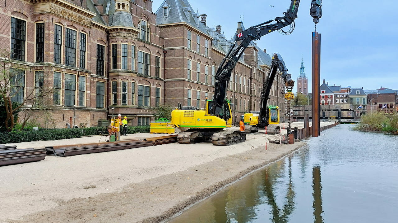 In ons eerdere Journaal hebben we uitgebreid verslag gedaan van de activiteiten van Van Schie in de Hofvijver. Zo hebben we een heuse ‘zandbank’ aangelegd langs de gevels van de Eerste Kamer en de Trêveszaal tot aan het torentje, met daaromheen een stalen damwandconstructie: 80 meter lang en 15 meter breed.