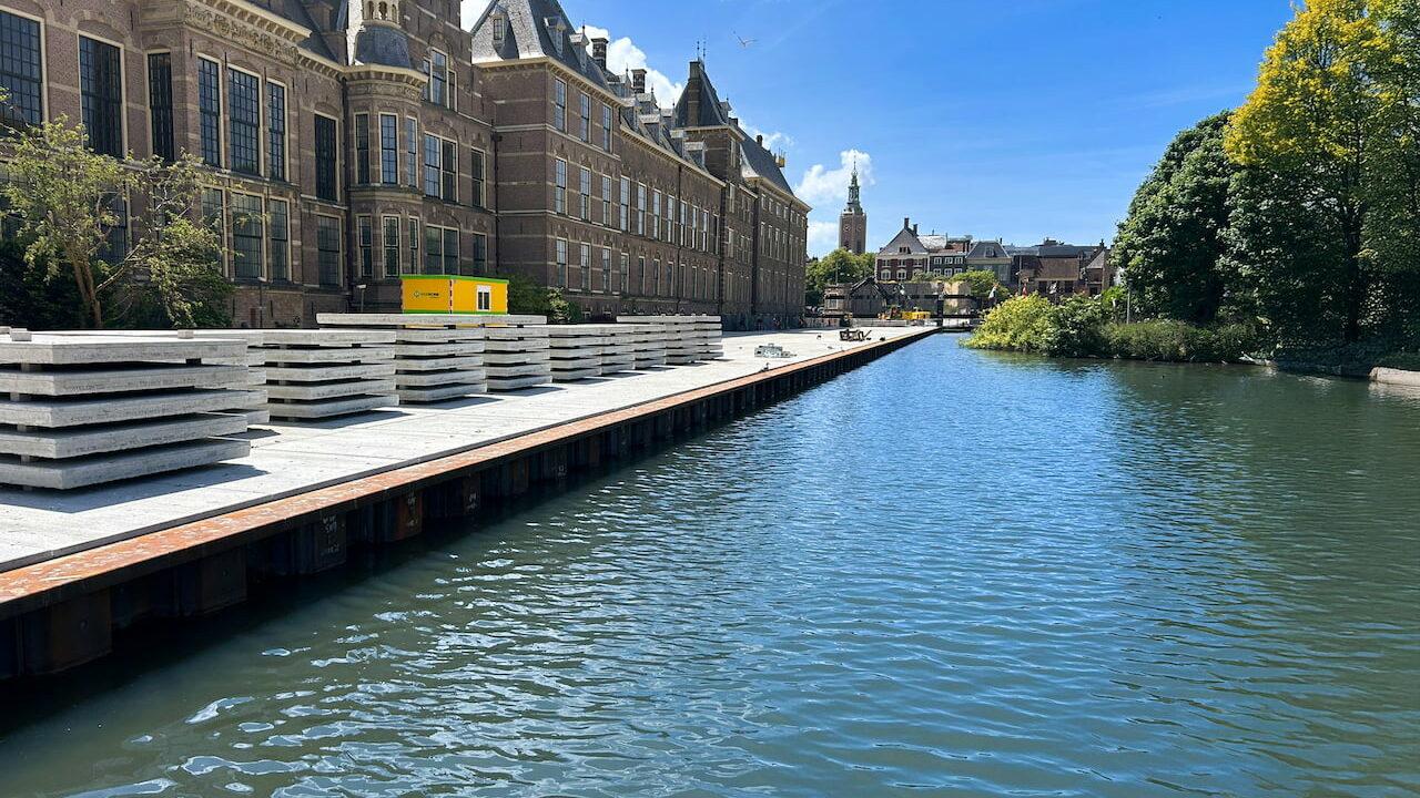 Dit alles om een bouwplaats te creëren voor de renovatie van alle gevels die aan de Hofvijver grenzen. Als sluitstuk heeft Van Schie nu een vloer van 800 betonplaten van 2×2 meter op het aanwezige zandpakket gelegd, als stabiele basis voor het bedrijf dat de funderingen gaat herstellen en de lekkende gevels gaat dichten.